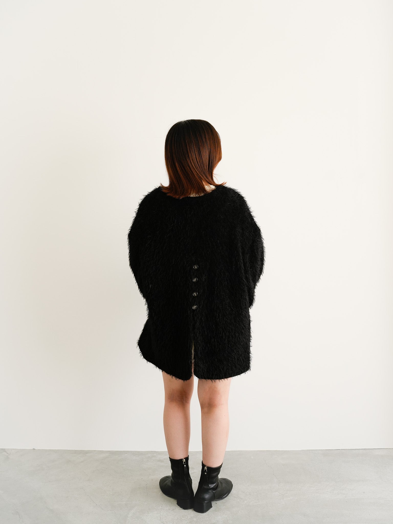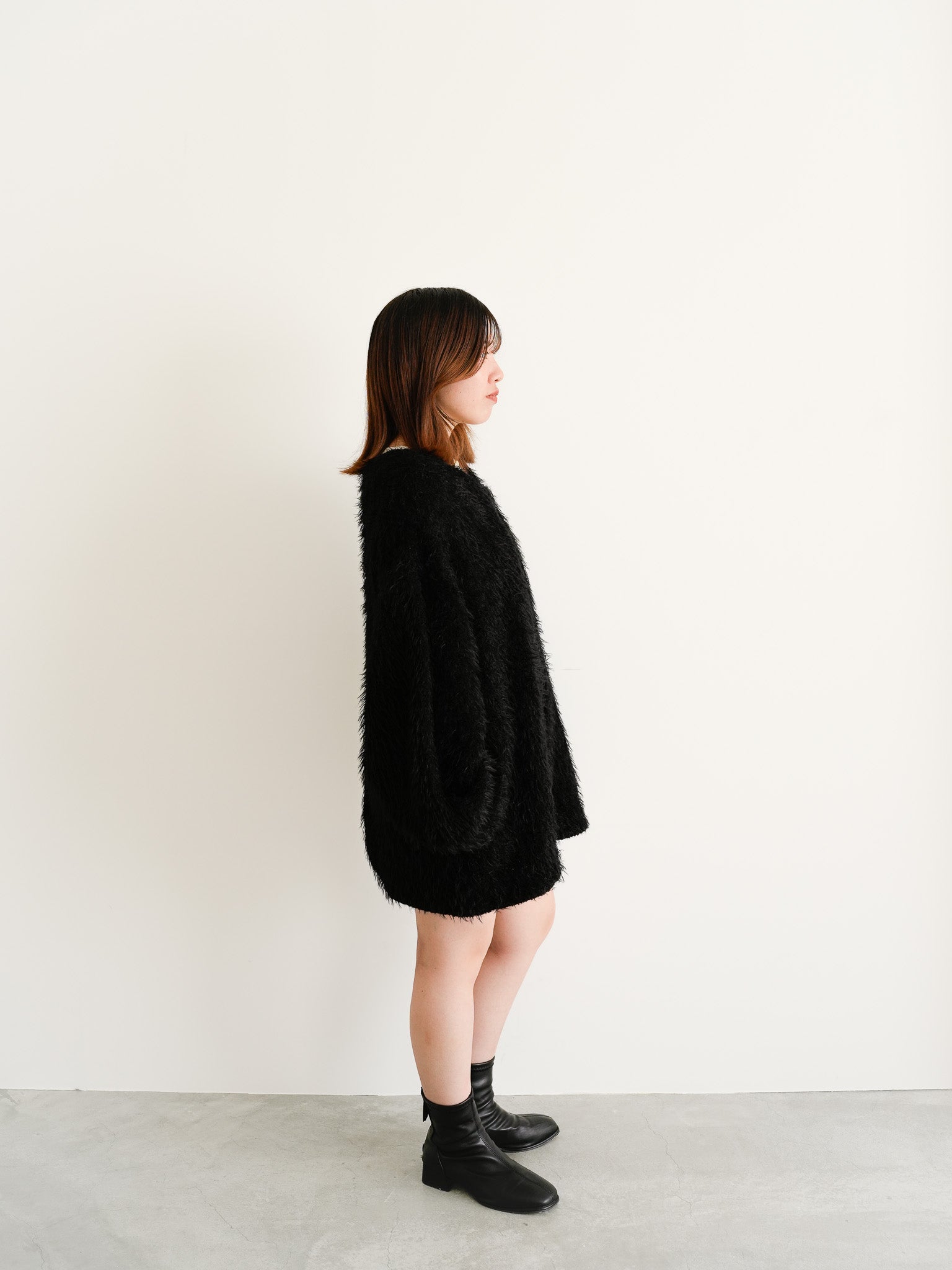 ショート丈のファーコートとミニボトムのバランスで魅せるモノトーンスタイル。
