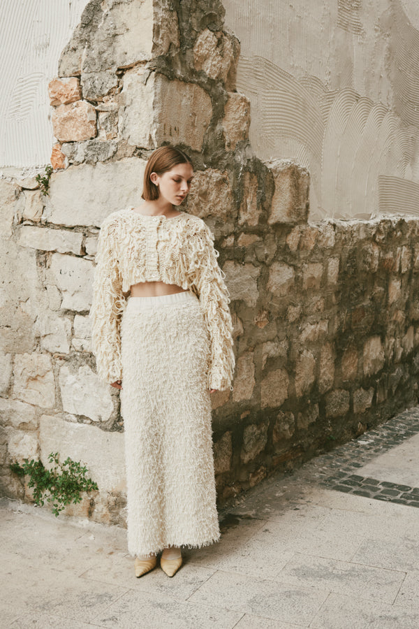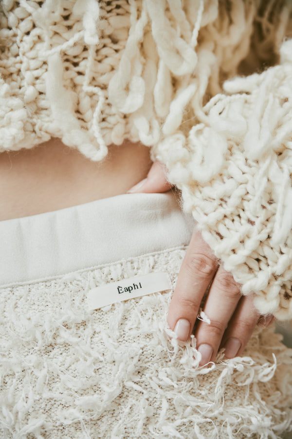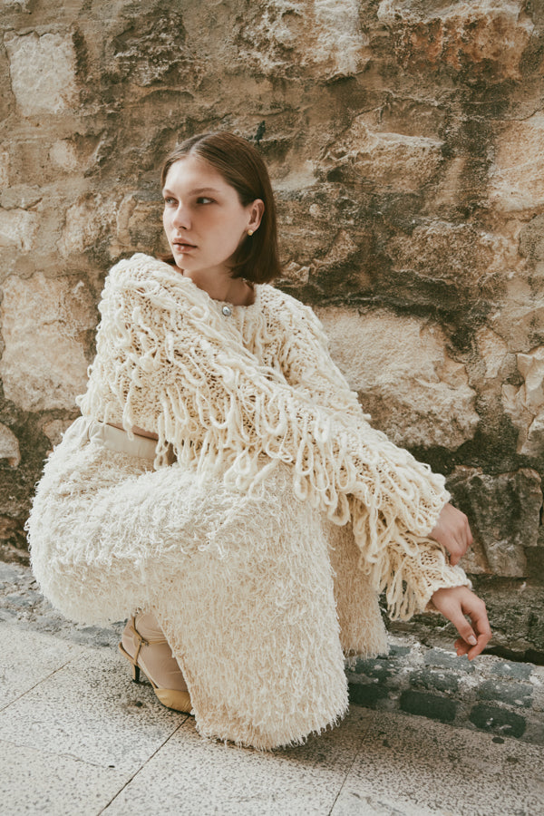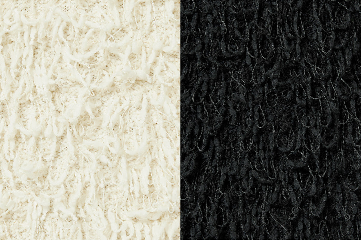 这件作品由两种颜色的环形线制成,并具有丰富,不均匀的感觉。