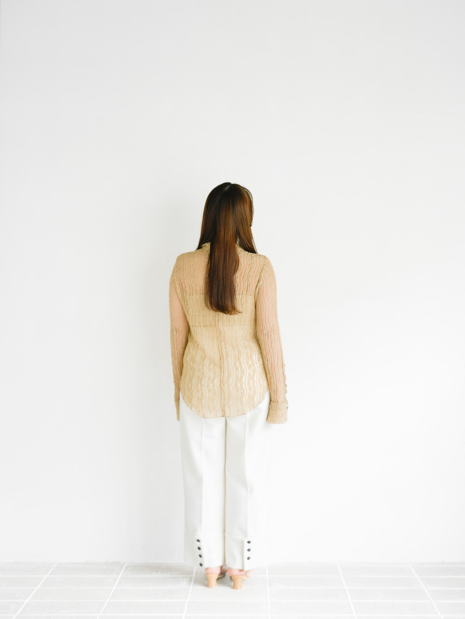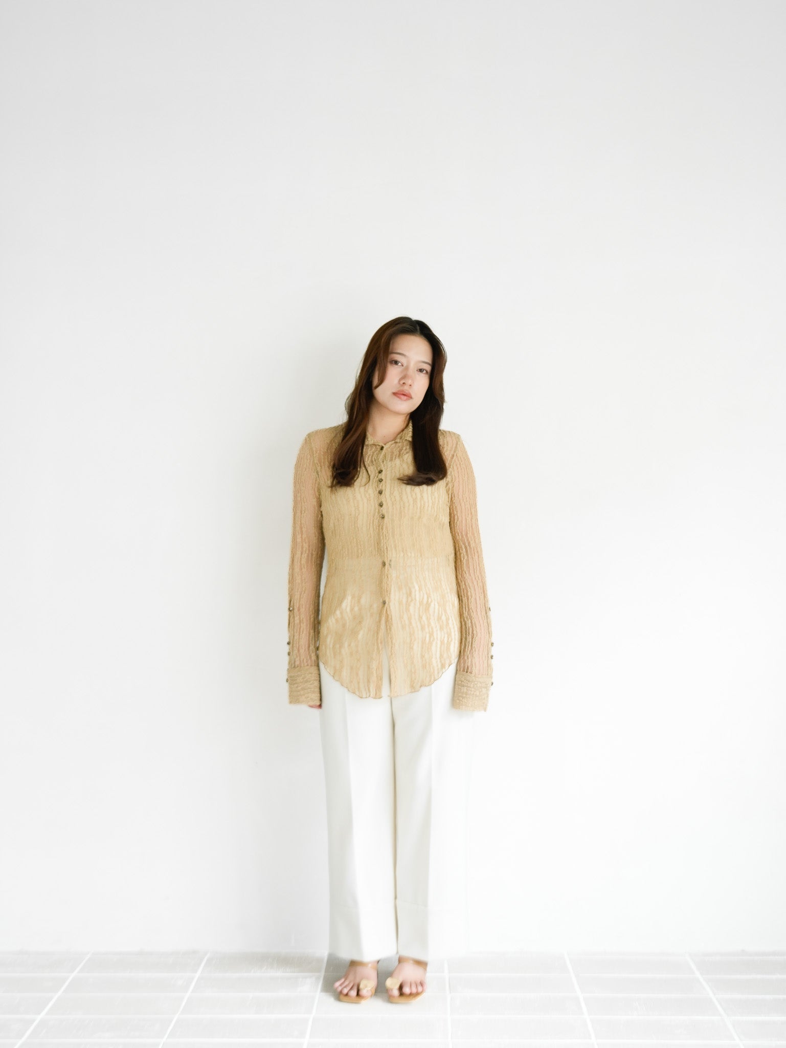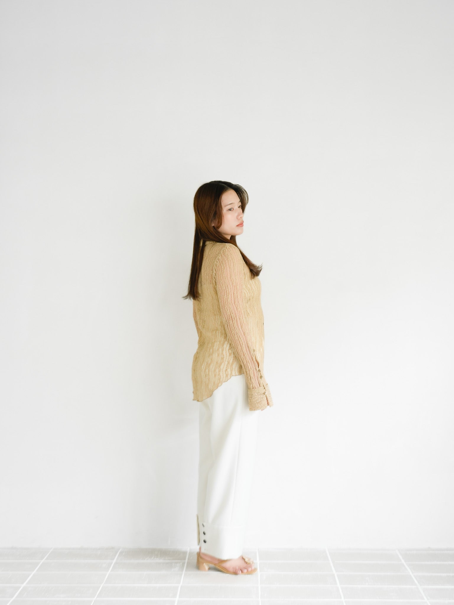 トップスのディテールが印象的で、動きに合わせてニュアンスが生まれるデザイン。リラックス感のあるワイドパンツで、抜け感をプラスしつつ、ナチュラルなトーンでまとめたバランスが魅力のコーディネートです。