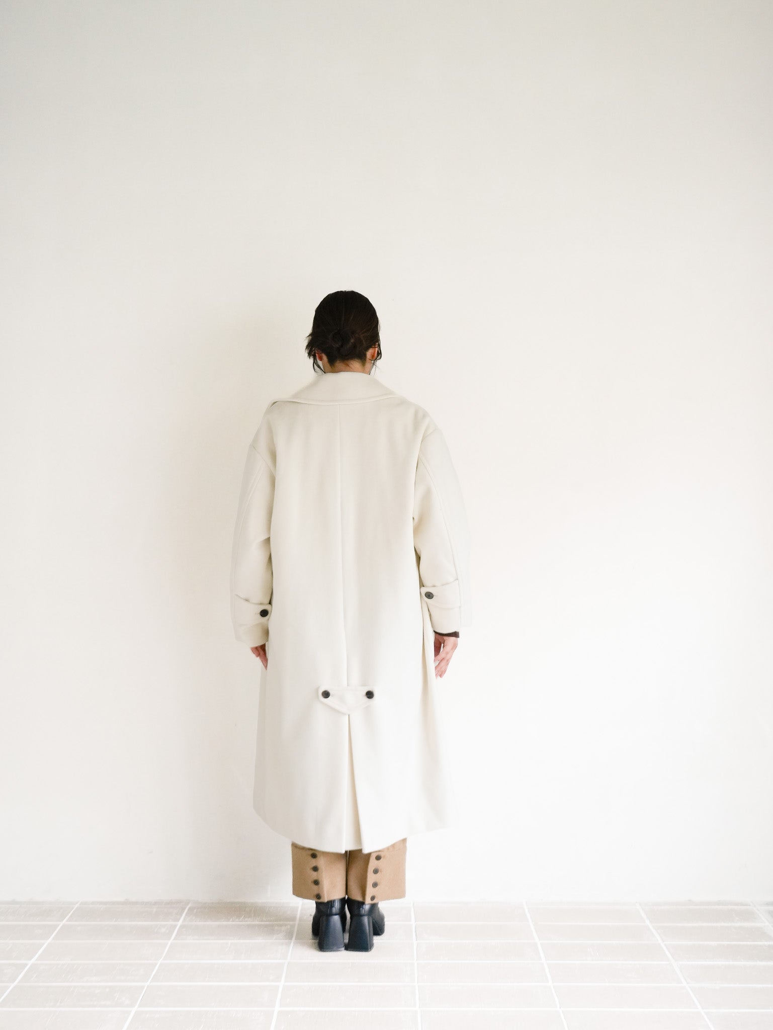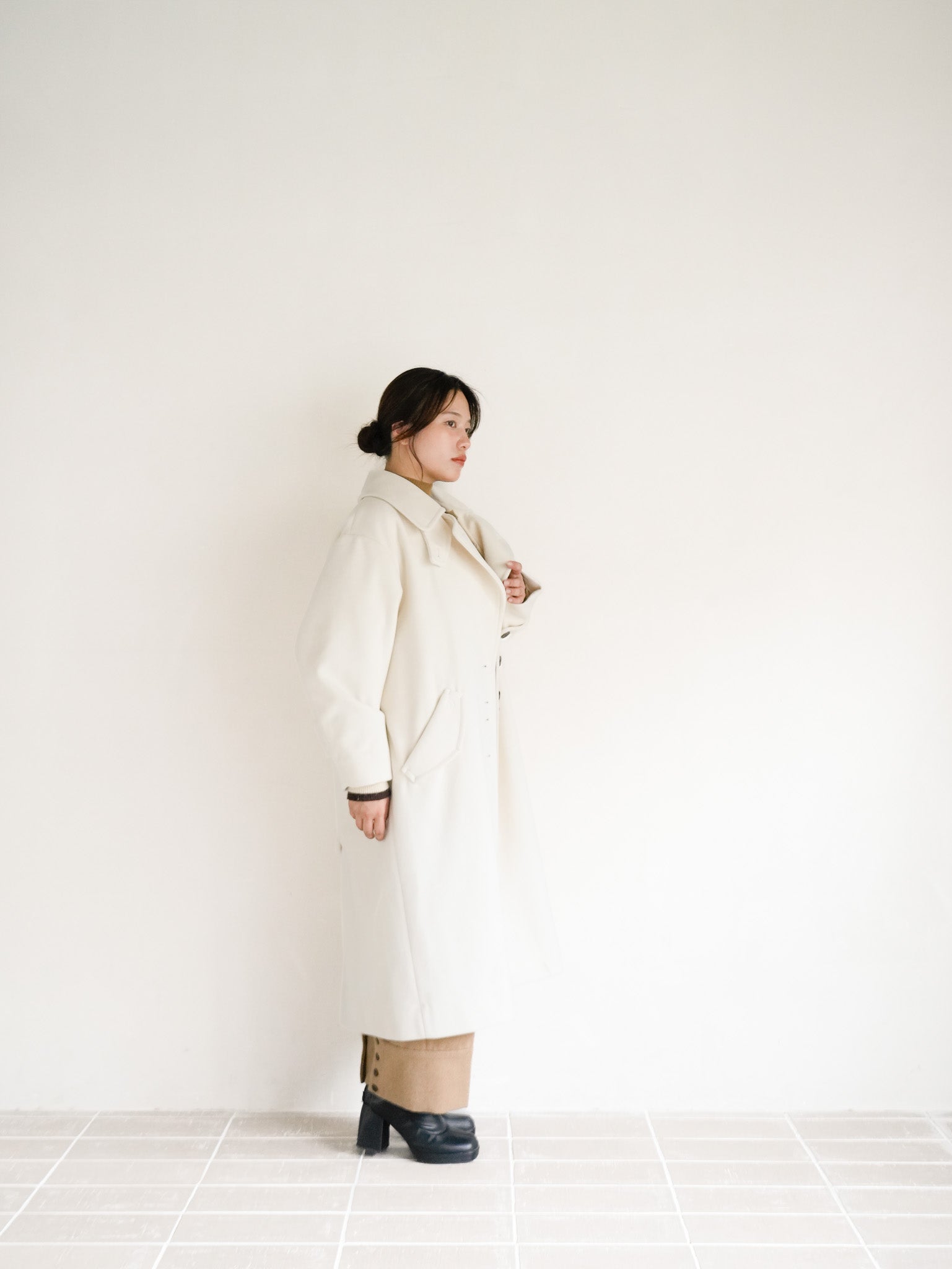 ホワイトのロングコートは、ゆったりとしたシルエットで抜け感を演出。中に仕込んだニットとパンツをブラウン系でまとめ、色のグラデーションで上品さを加えたスタイリングです。