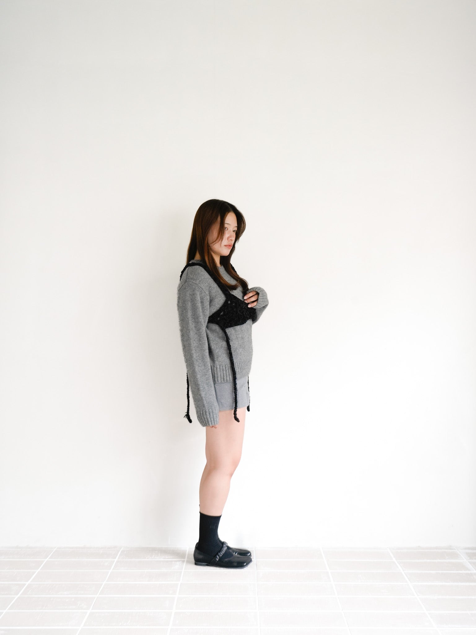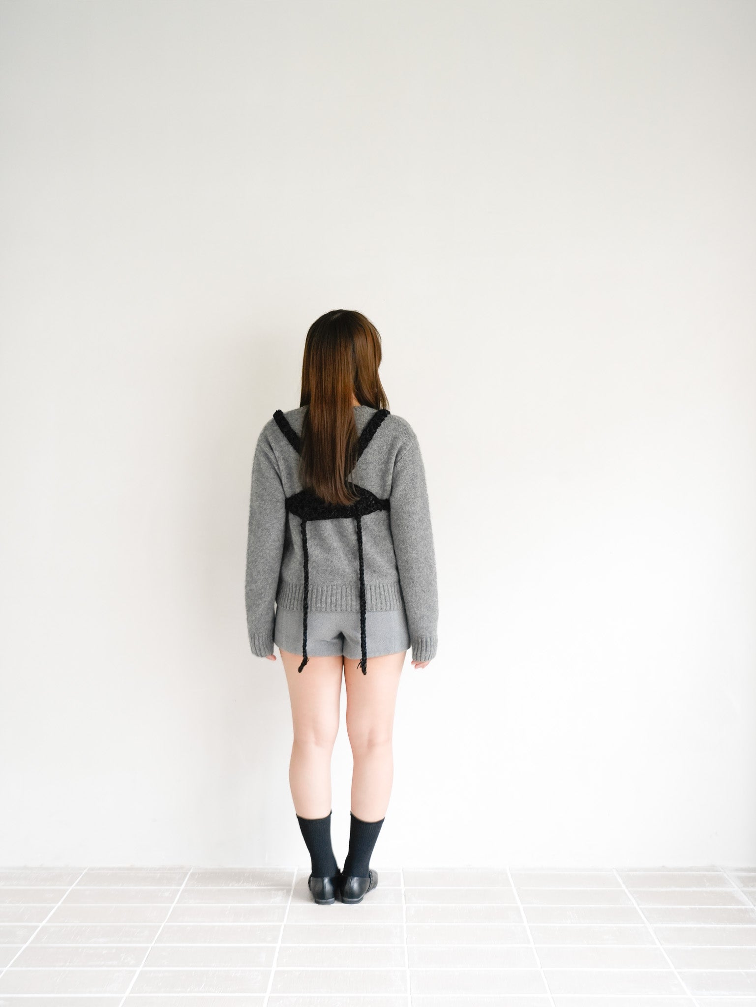 グレーのニットに、ブラックのビスチェをレイヤードした遊び心あるスタイル。