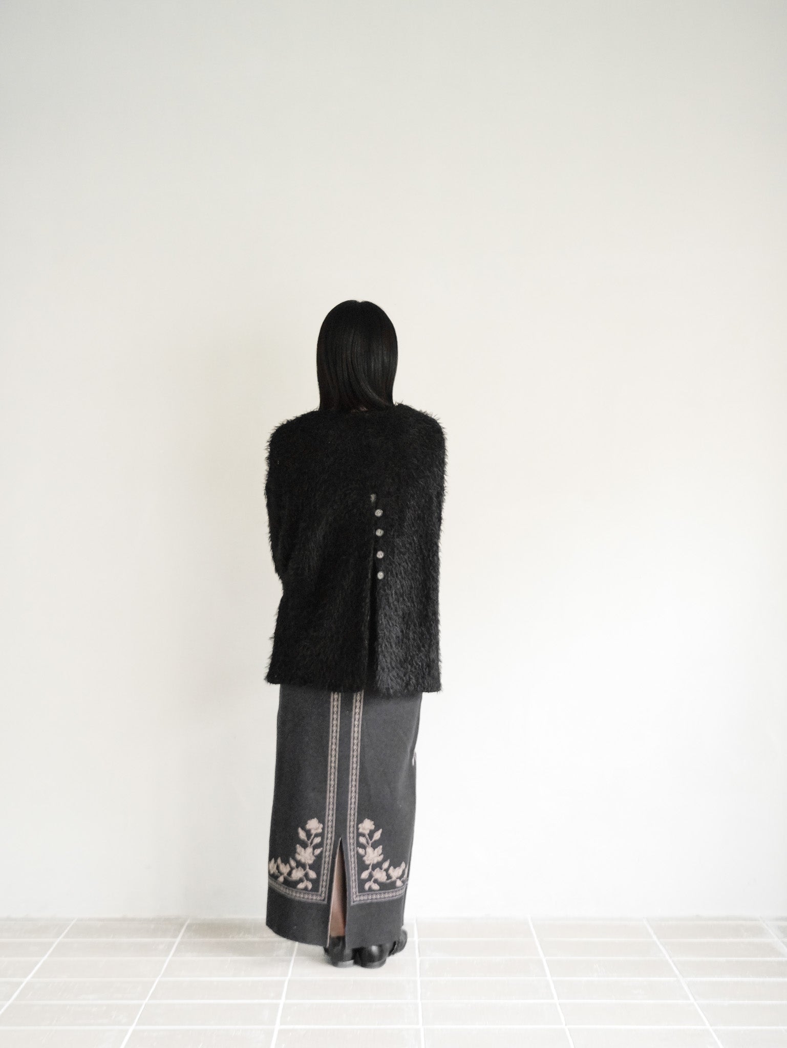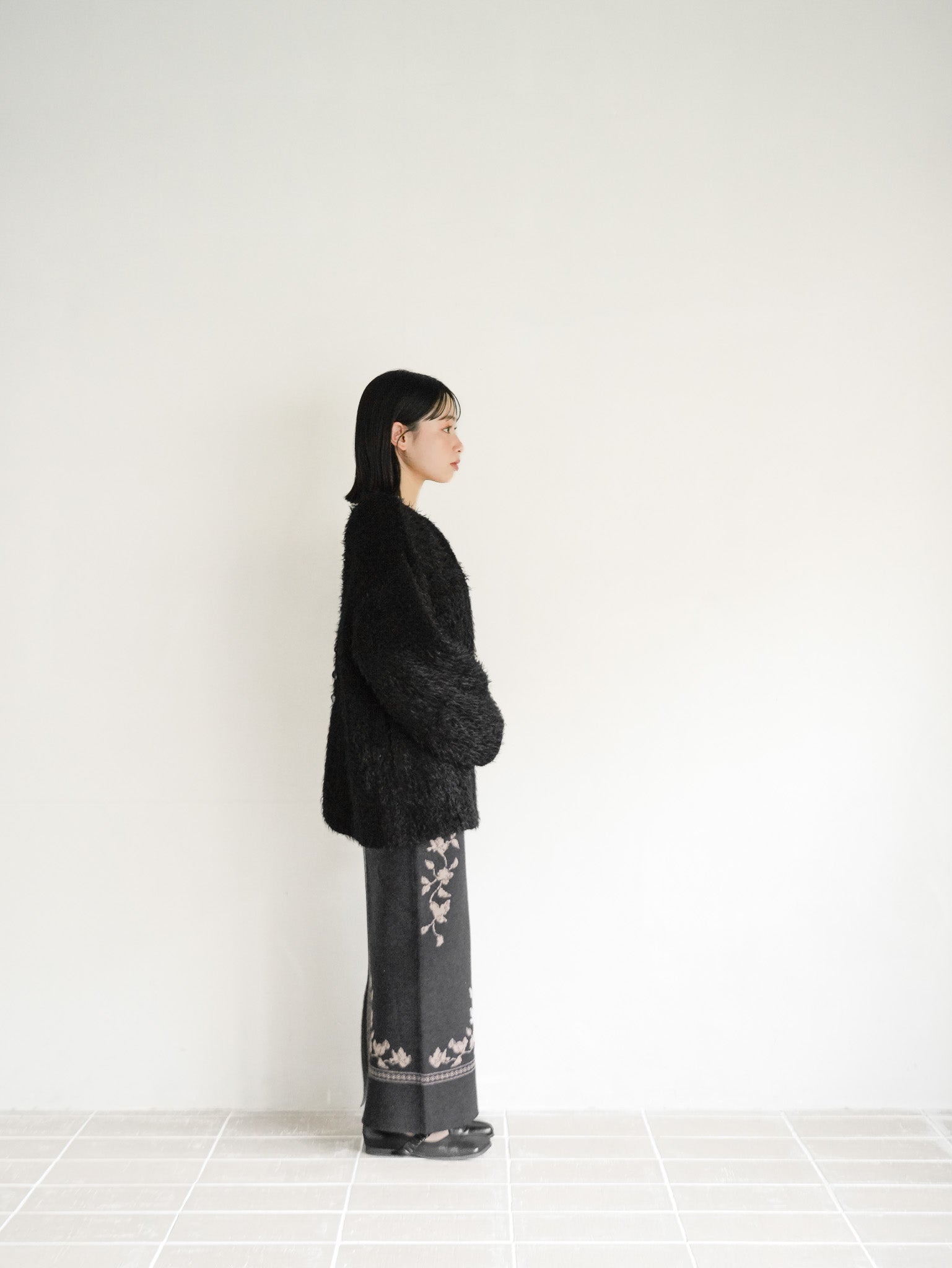 毛足のあるブラックアウターの中に、透け感のあるアイボリーのカットソーを覗かせて軽さをプラス。スカートはダークトーンに控えめな花柄が施されており、全体のトーンを落ち着かせながらも印象的なコーディネートです。