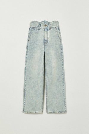 ブルーのデニムを合わせることで、クラシカルな印象に程よいカジュアルさをプラス。やわらかな配色と異素材使いが、さりげなく女性らしさを引き立てるコーディネートです。