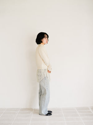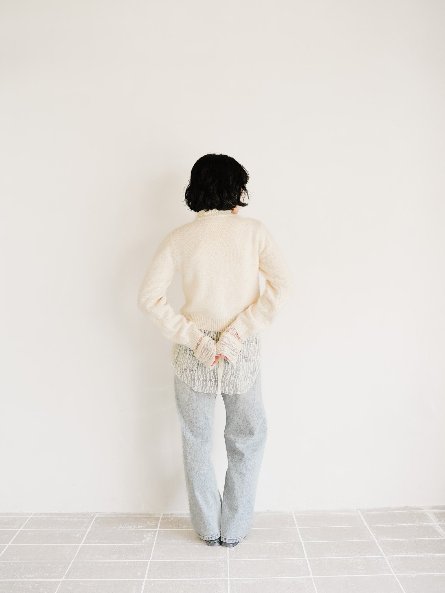 レースのインナーをのぞかせたカーディガンレイヤードで、繊細な抜け感溢れるスタイル。