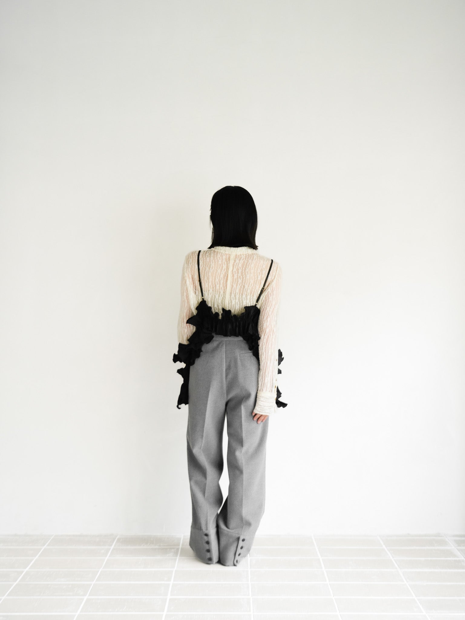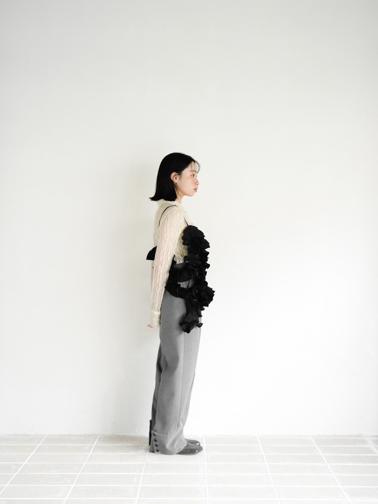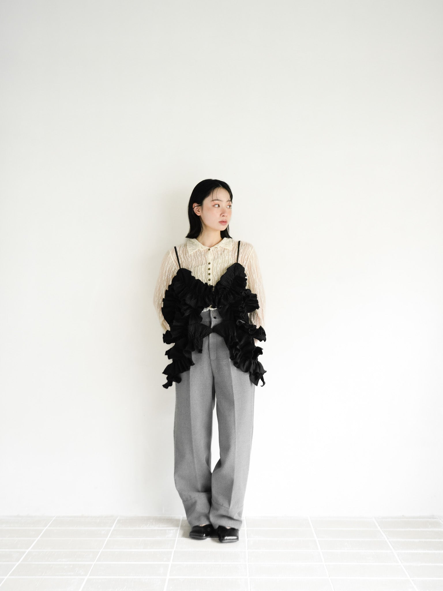 透け感のあるアイボリーのシャツに、立体的なブラックフリルのビスチェを重ねて視線を集めるコーディネート。ボトムスにはグレーのウールパンツを合わせて、甘さとマニッシュさを絶妙にミックスした着こなしに仕上げています。