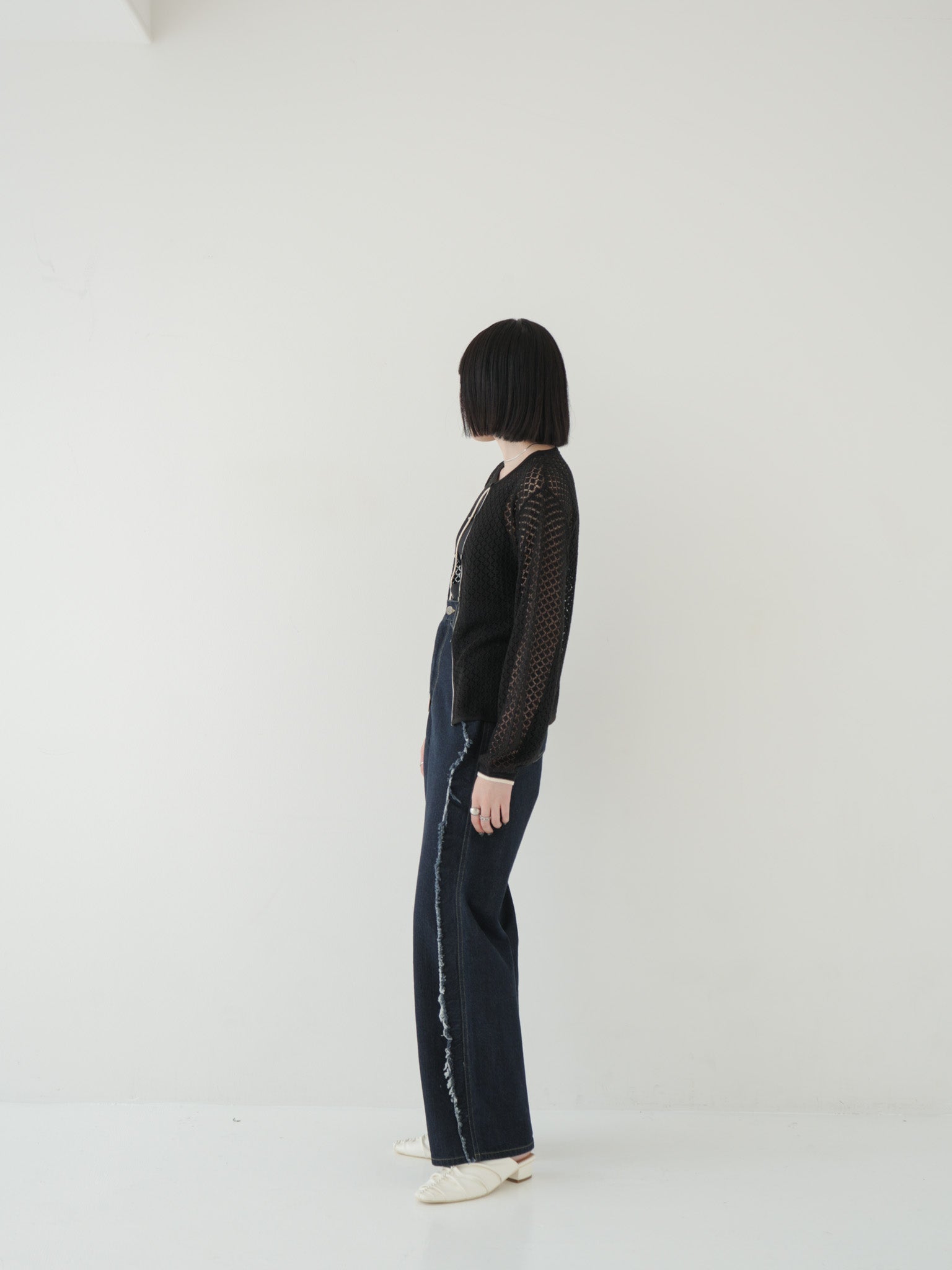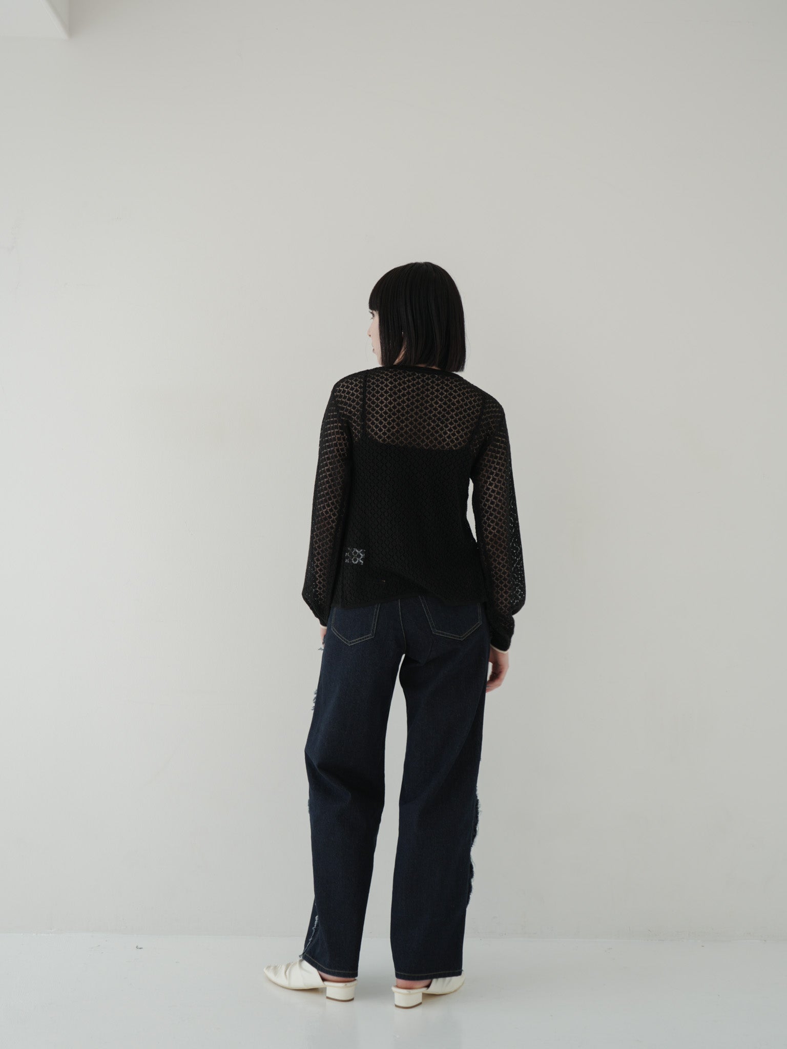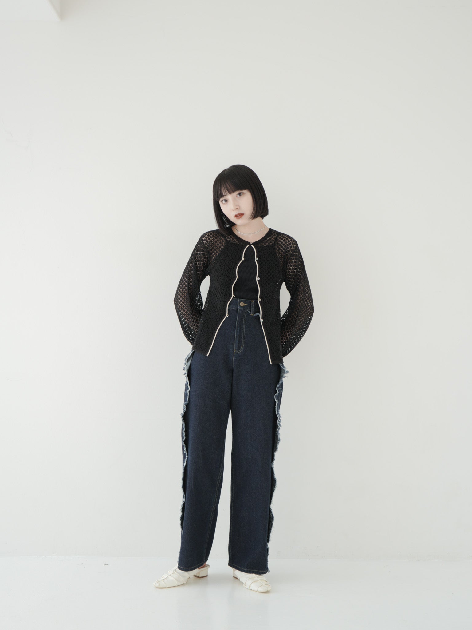 ブラックの透かし編みカーディガンにデニムを合わせたコーデ。エッジの効いたディテールがモード感を引き立てつつ、デニムで抜け感をプラスしています。