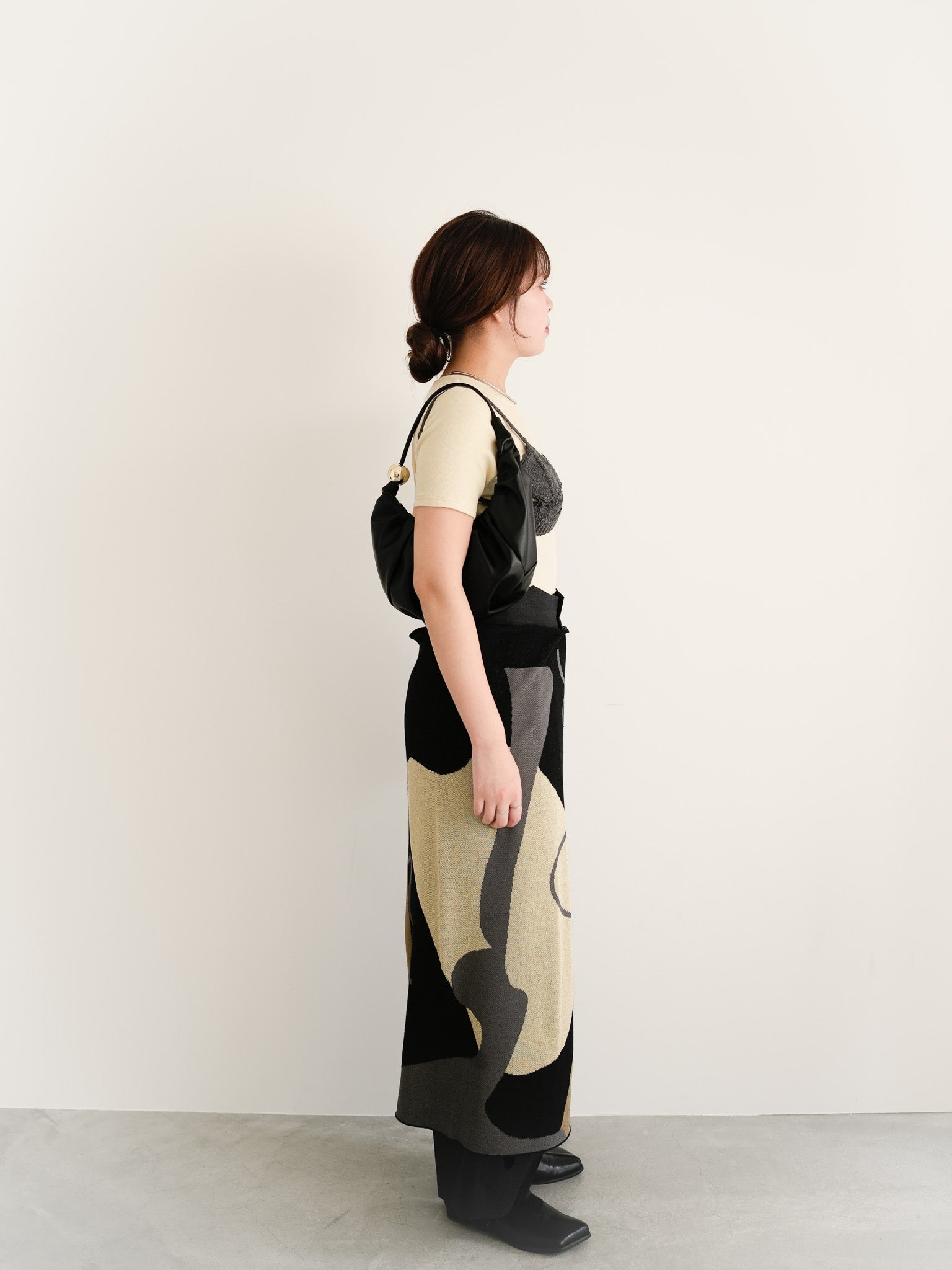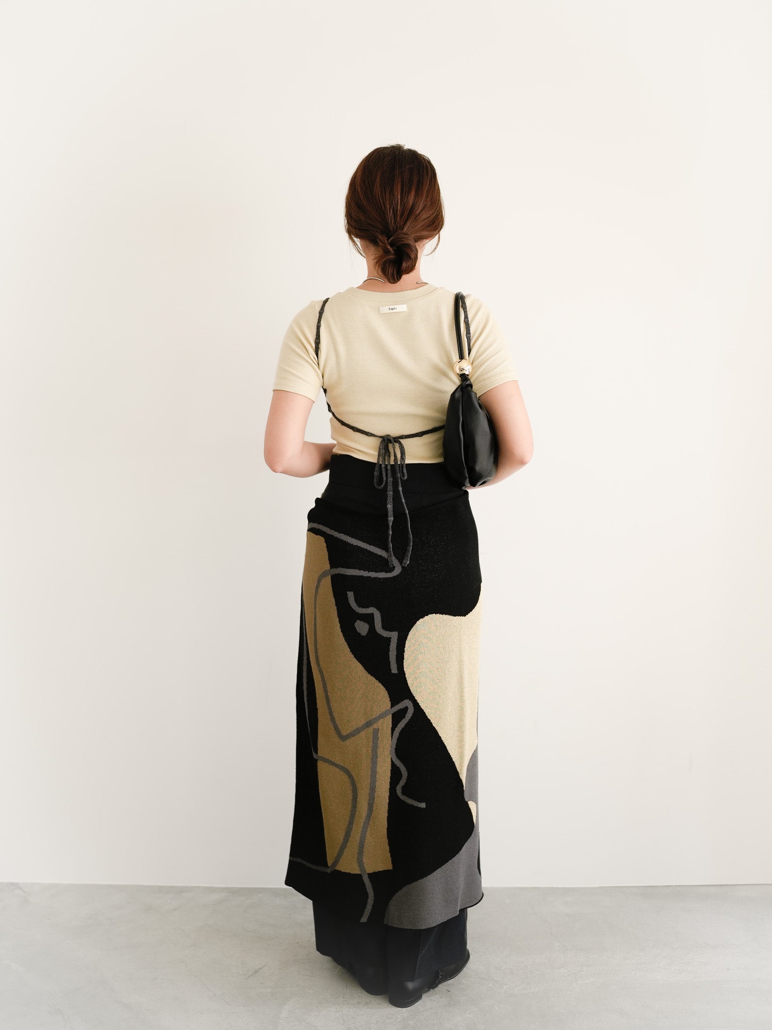 サマーニットにレースビスチェを重ね、グラフィカルな巻きスカートでアートな印象に。カラーを抑えたモノトーン配色で、モードとエレガンスが共存する装いに仕上げました。