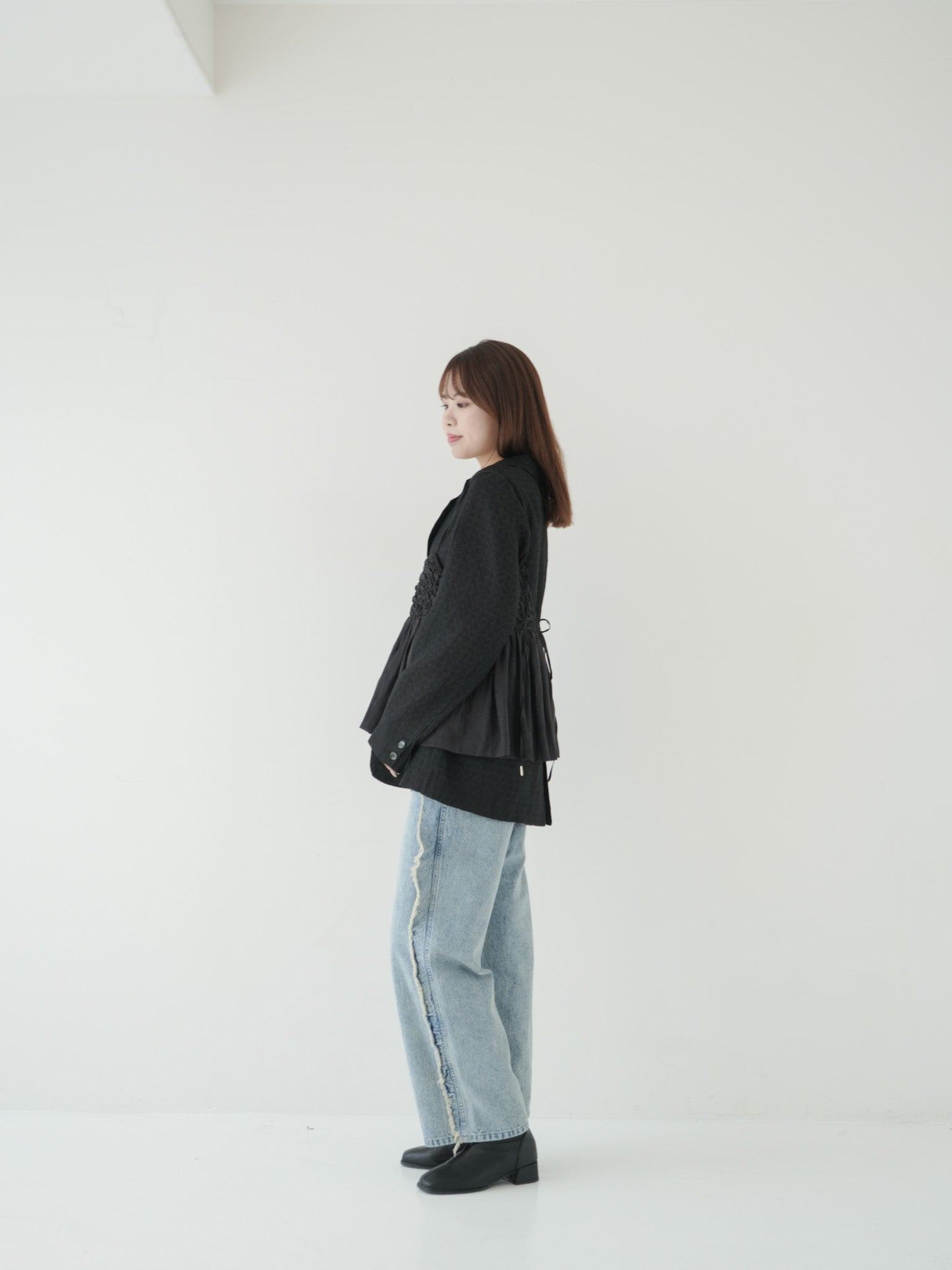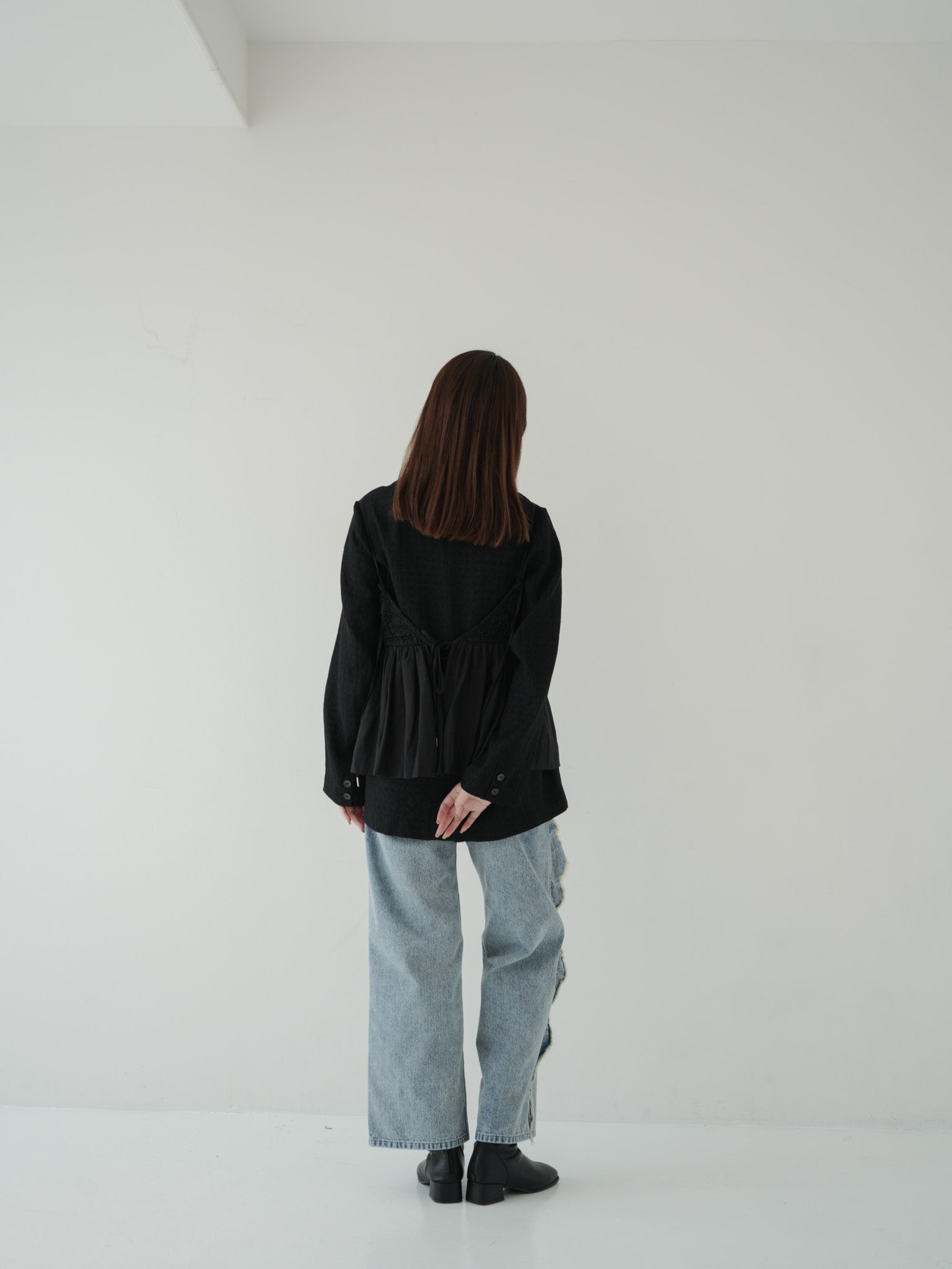 シアージャケットに立体感のあるビスチェをレーヤードし、フリンジラインが印象的なデニムを合わせたスタイリング。カジュアルさの中にフェミニンなムードが漂う、今季らしいバランスです。