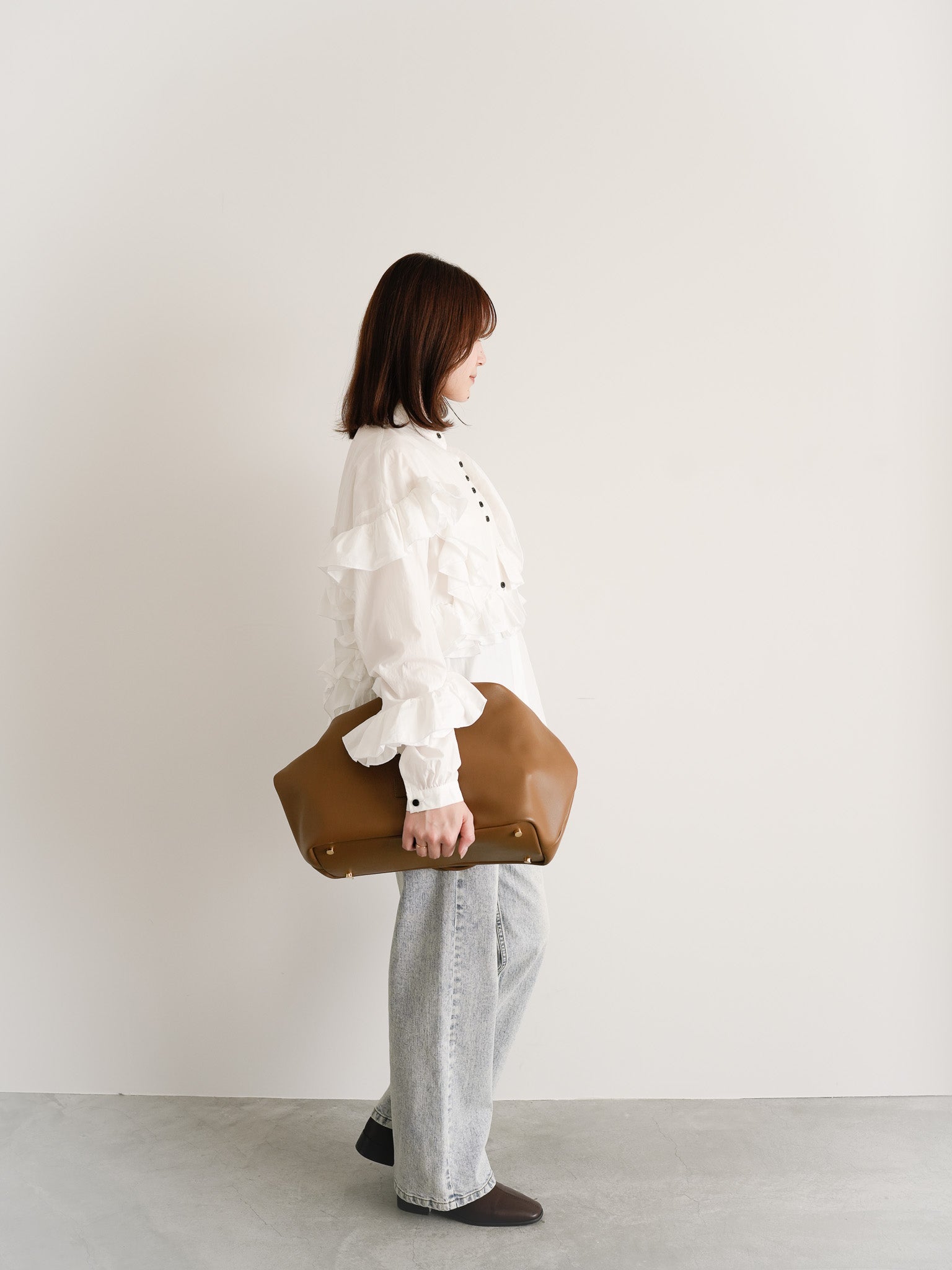 ブラウンのバッグでトーンを繋ぎ、甘さを程よく中和。軽やかさと強さを併せ持つ、フェミニンモードな着こなしに仕上げました。