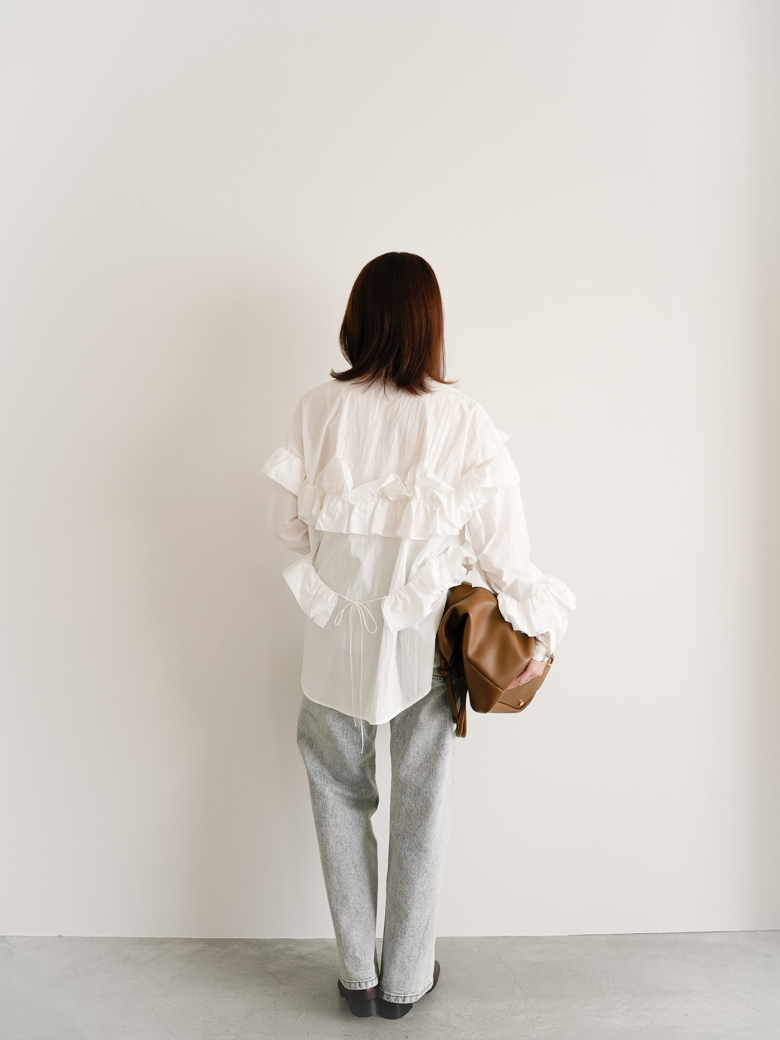 存在感あるフリルブラウスに、ライトブルーのデニムを合わせたクラシカルカジュアルスタイル。