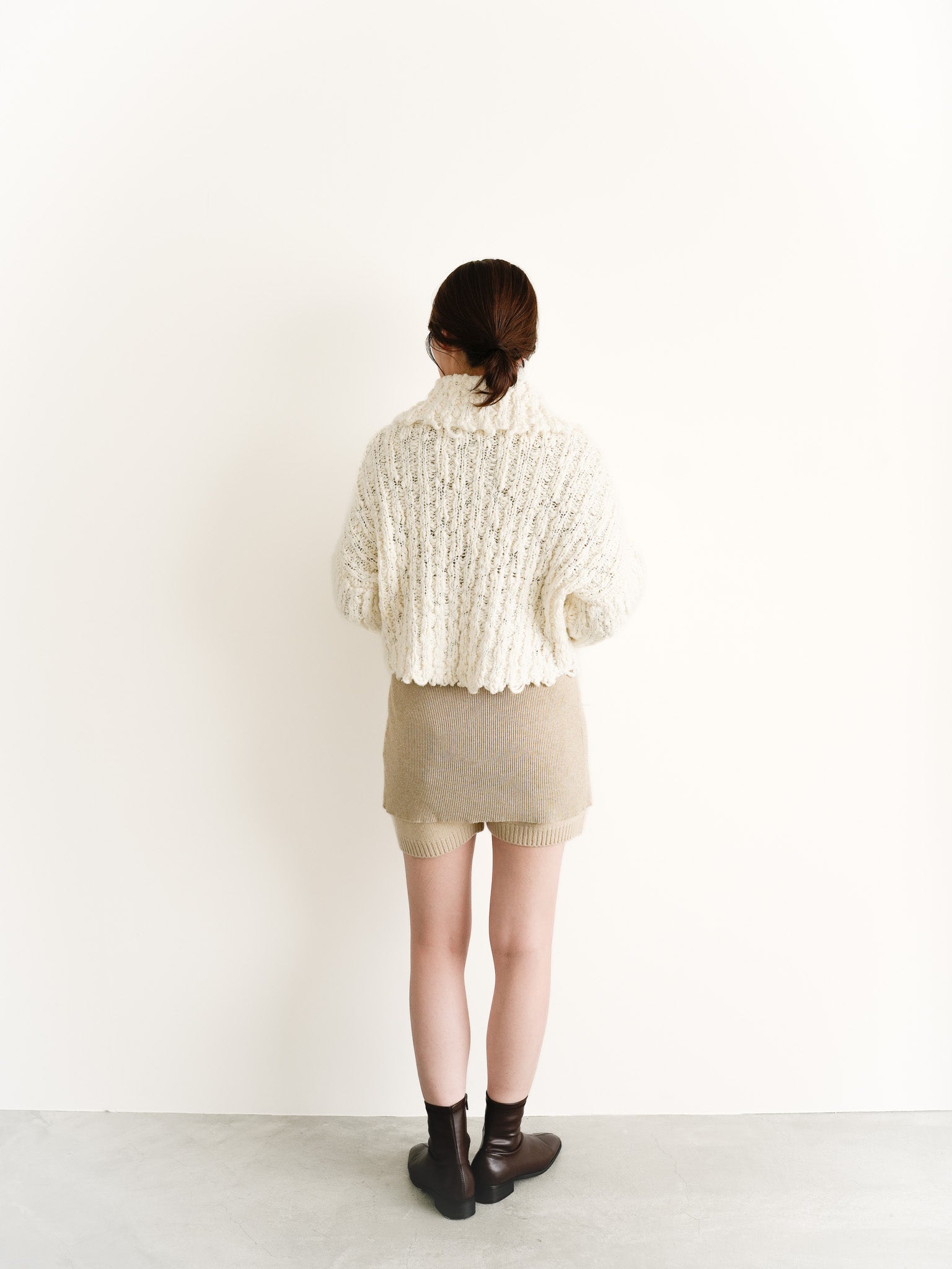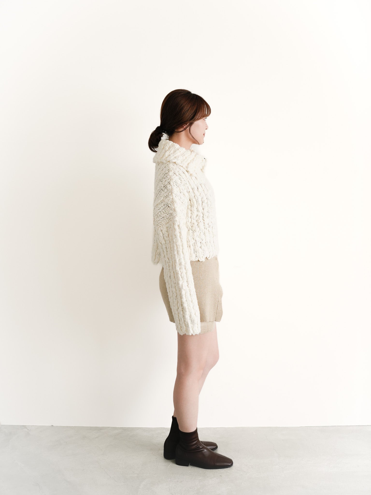 質感のある厚手のニットにショート丈のニットパンツを合わせ、冬の軽やかさを表現。