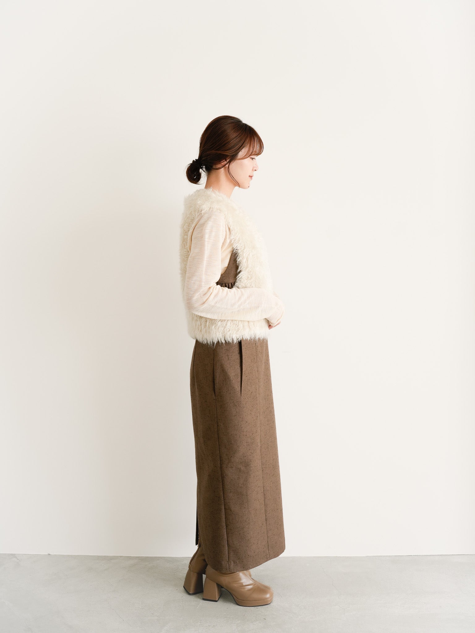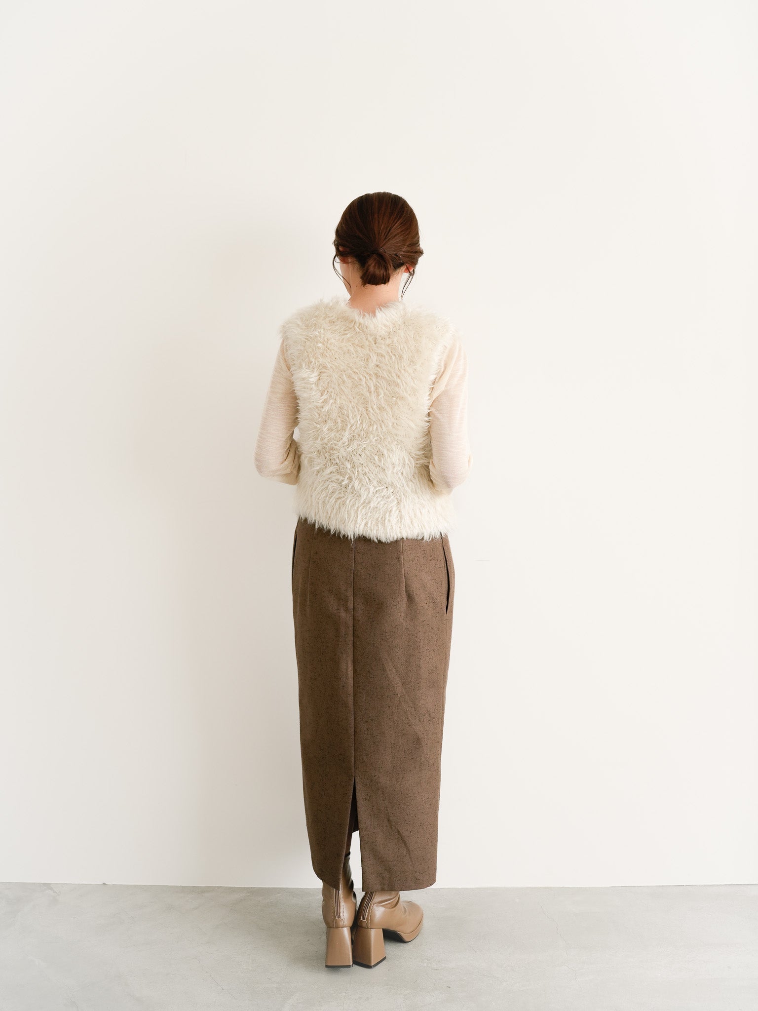 ブラウンのスカートで落ち着きをプラスし、ワントーンの中に質感の変化を持たせた。上品なニュアンスカラーでまとめた、あたたかみのある冬のスタイルです。