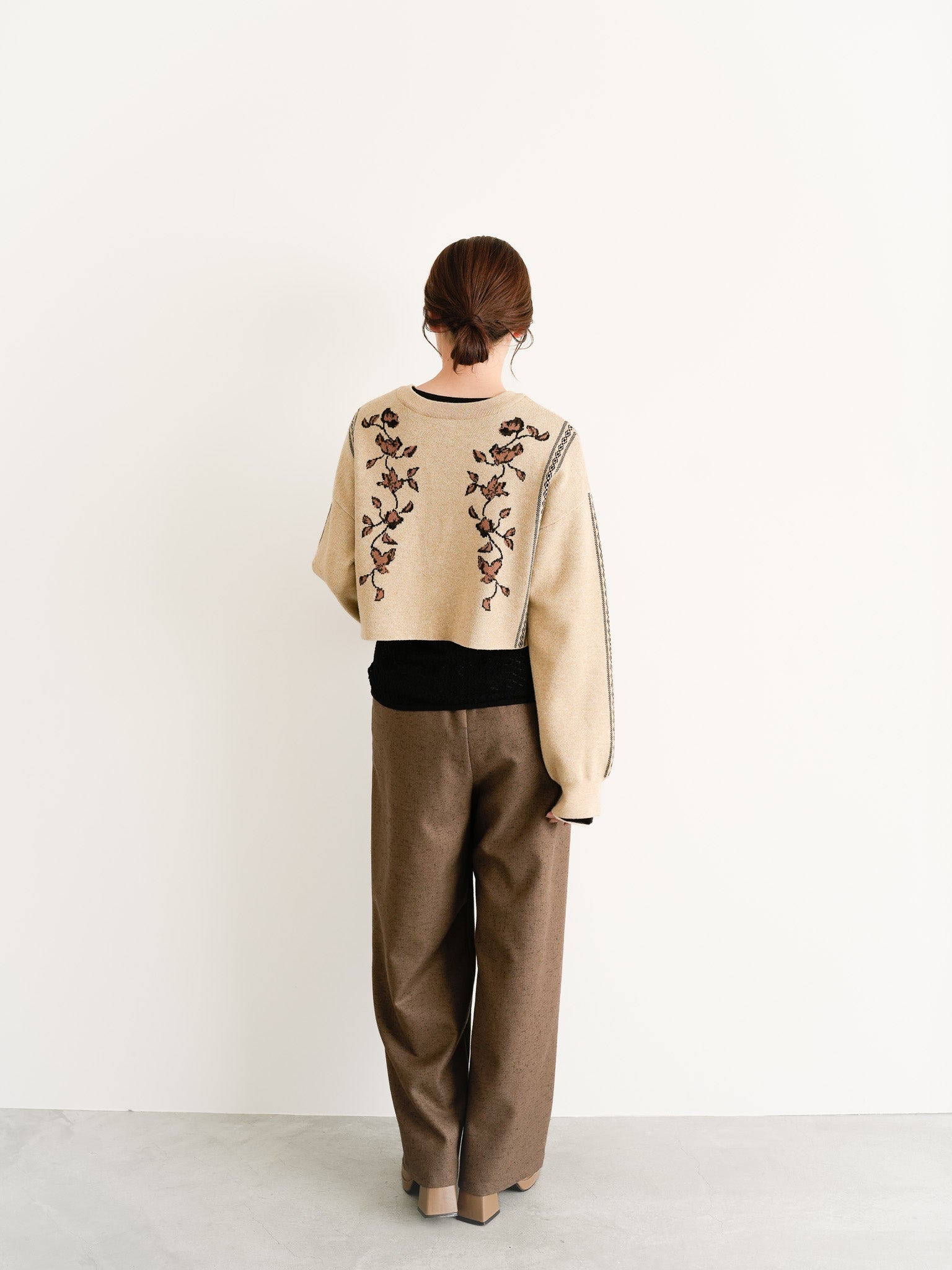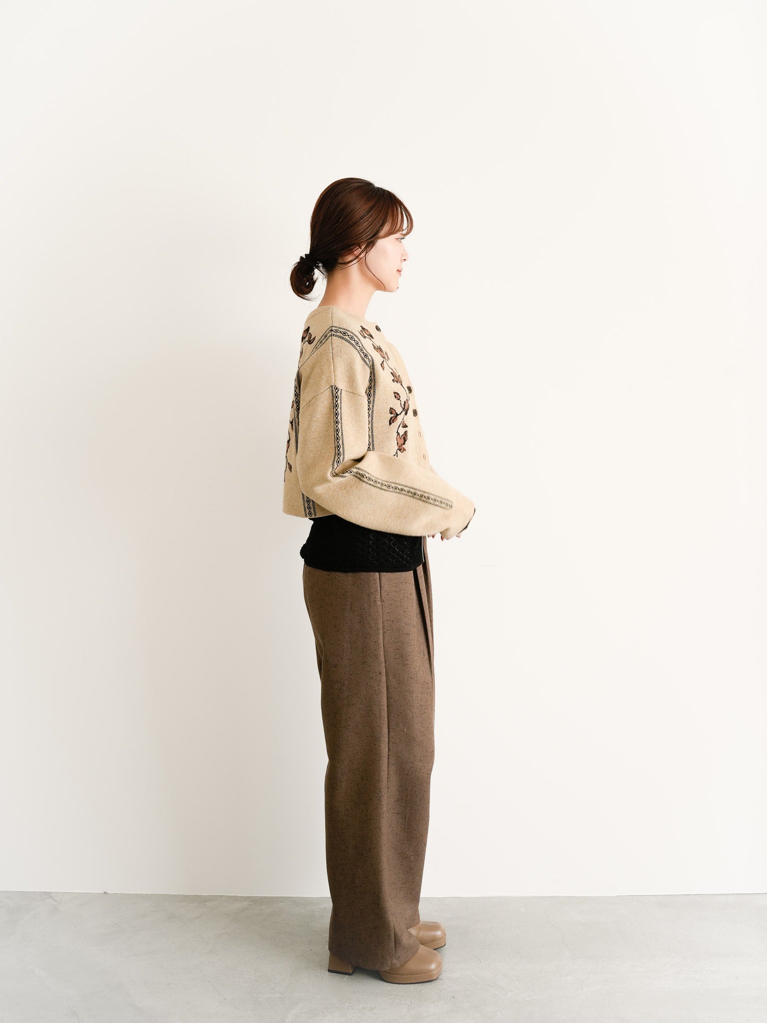 立体的な刺繍が印象的なカーディガンを主役に、落ち着いたブラウンのワイドパンツを合わせたクラシックルック。