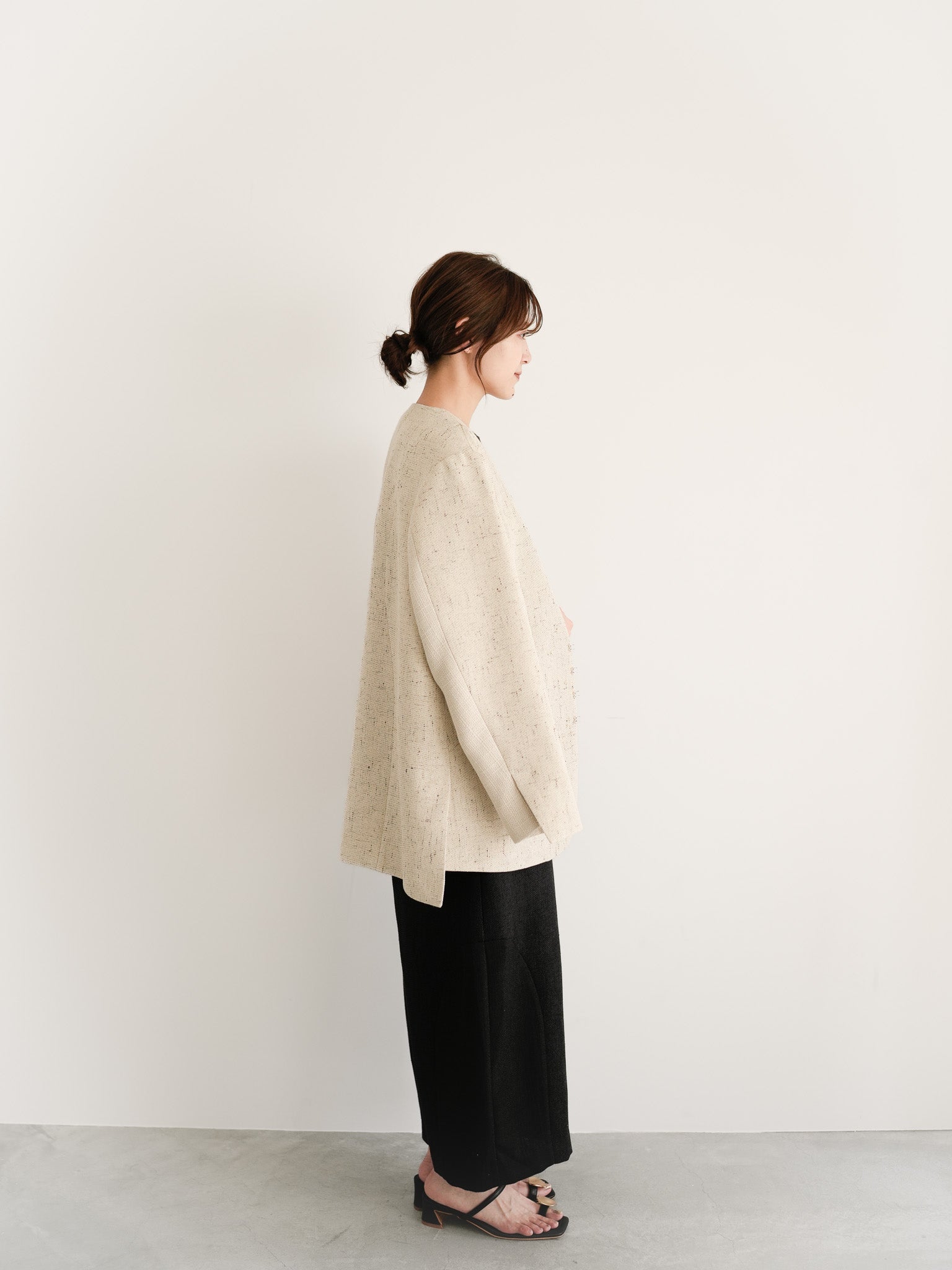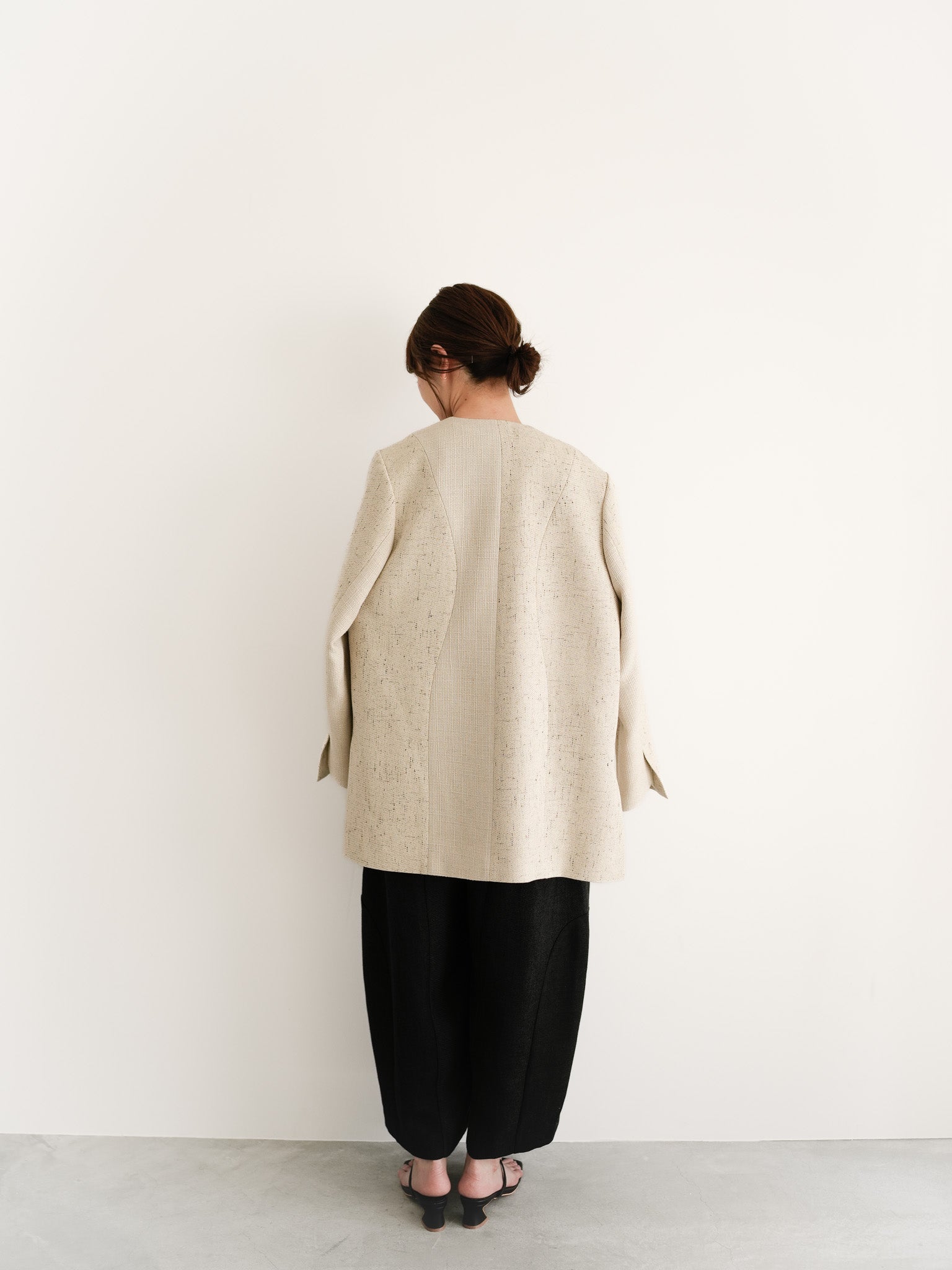 立体的なシルエットのブラックオールインワンに、ナチュラルなジャケットを肩掛けして。異素材のコントラストが引き立つ、静かに力強いスタイリングです。