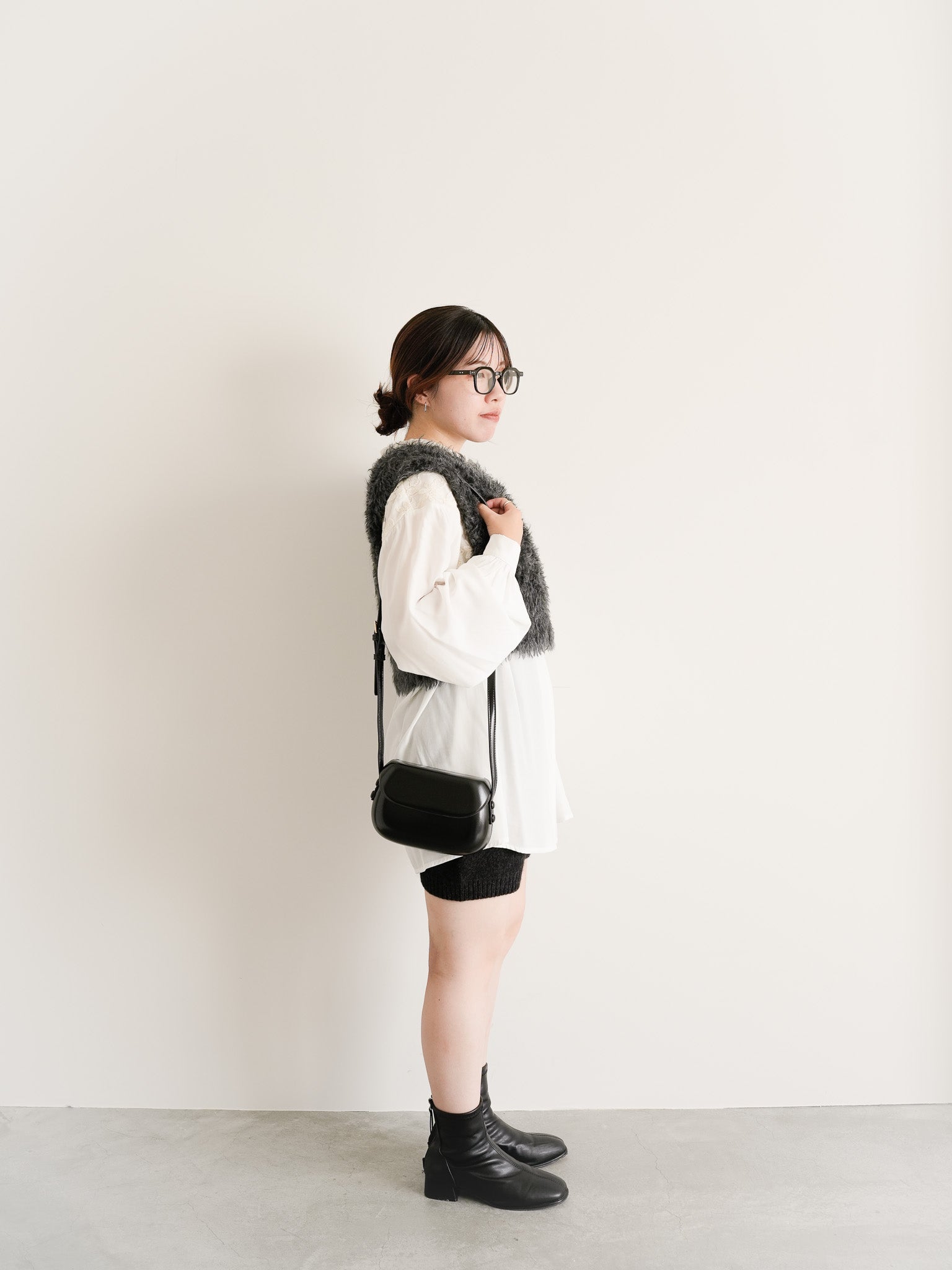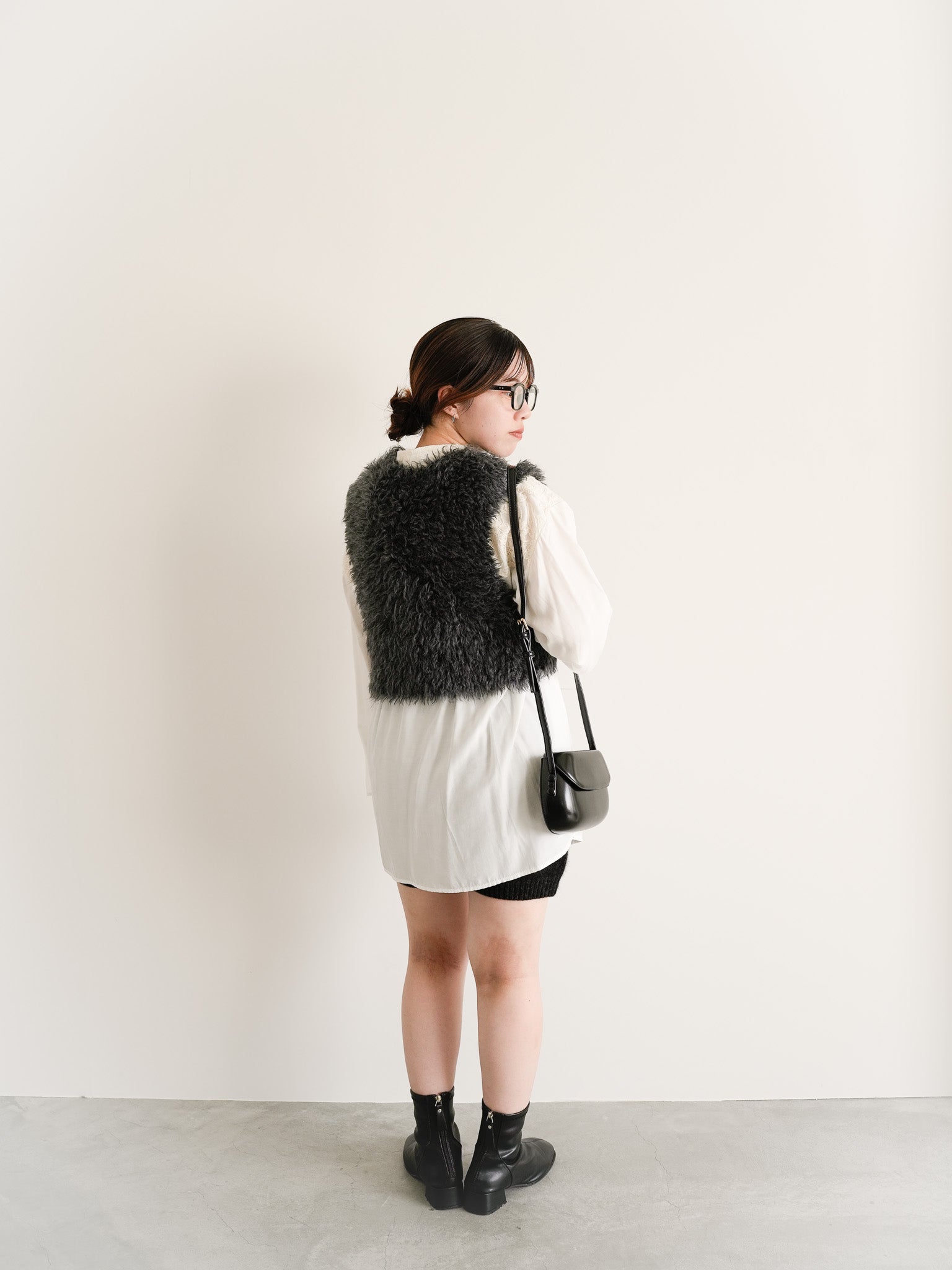 オーバーサイズのシャツにファーベストを重ね、ショートパンツでバランスを取ったレイヤードスタイル。遊び心とモードを共存させた、軽やかで立体感のあるスタイリングです。