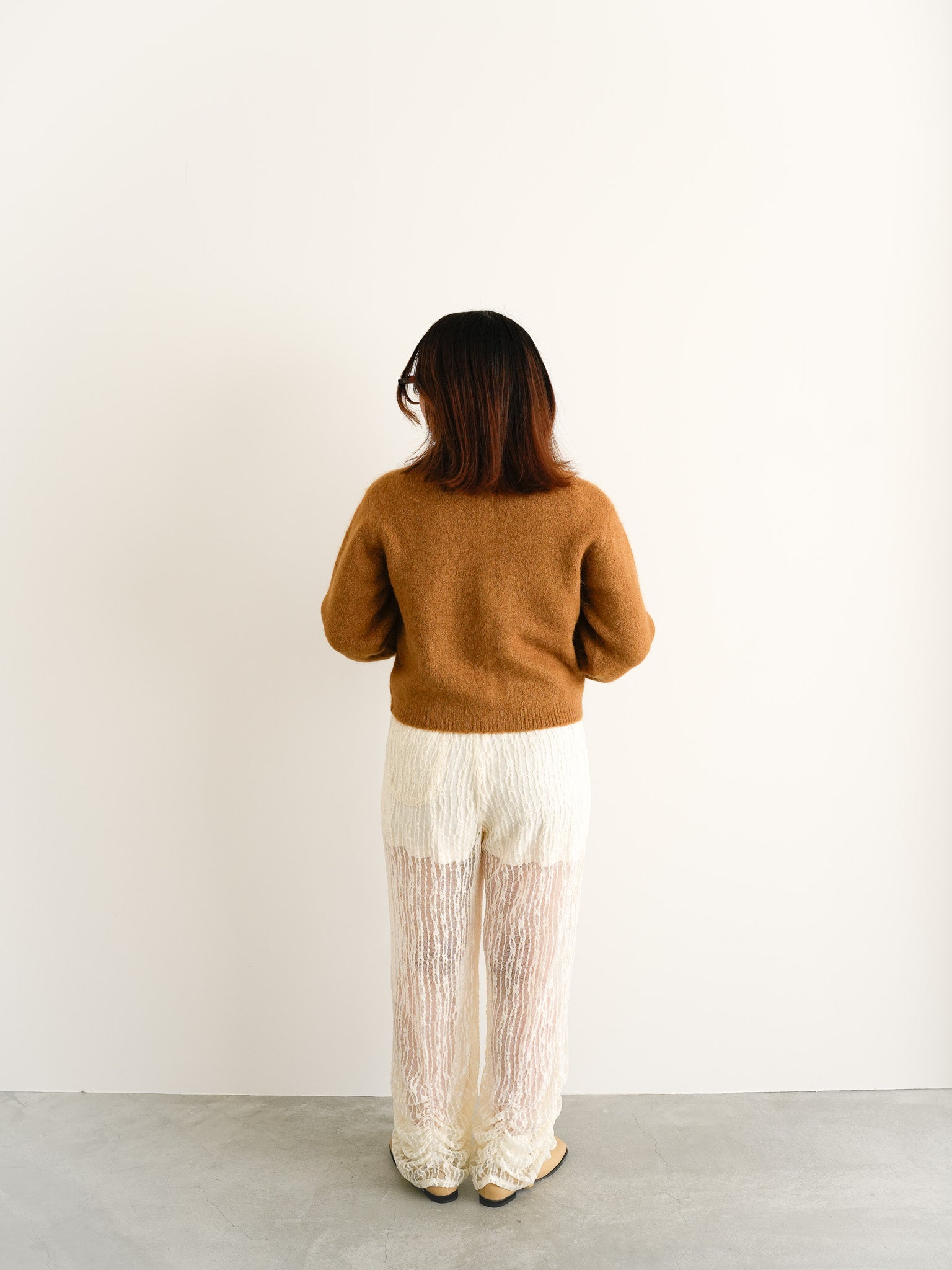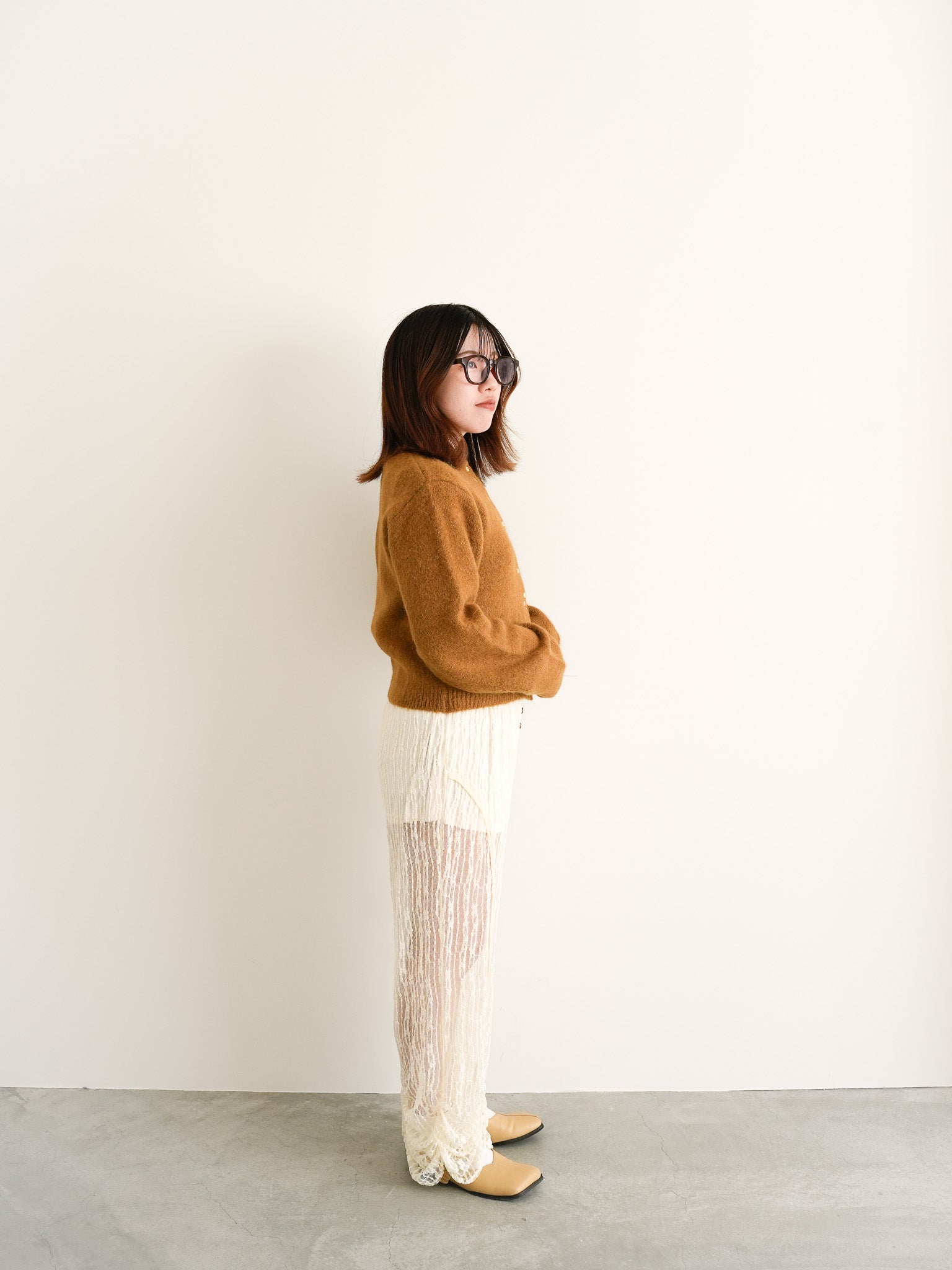 キャメルカラーのカーディガンに、レースパンツを合わせた異素材ミックス。柔らかな透け感が冬の光を受け、あたたかさと軽やかさを同時に纏うスタイリングです。
